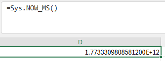 Returns a large number: milliseconds since the UNIX epoch. Try editing any cell in the sheet and watch the value change. This function is marked volatile, which tells Excel to recalculate it on every sheet change. It’s not marked threadsafe here, but the two aren’t mutually exclusive. A function can be both volatile (recalculates on every change) and thread-safe (Excel can call it from multiple calculation threads). For NOW_MS it doesn’t matter much, but for a volatile function doing heavier work, adding threadsafe lets Excel parallelize the calls.