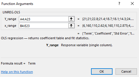 Most formulas follow the same pattern: =LINREG.FUNCTIONNAME(y_range, x_range, ...). The regularized methods (Ridge, Lasso, Elastic Net) and their cross-validation variants require additional parameters like lambda and alpha. A few UDFs diverge further: LINREG.VERSION() takes no arguments, LINREG.WLS adds a weights range, and LINREG.PREDICTIONINTERVALS adds a new-data range. The Function Wizard provides per-argument help text for all of them. Results spill automatically in Excel 365+.