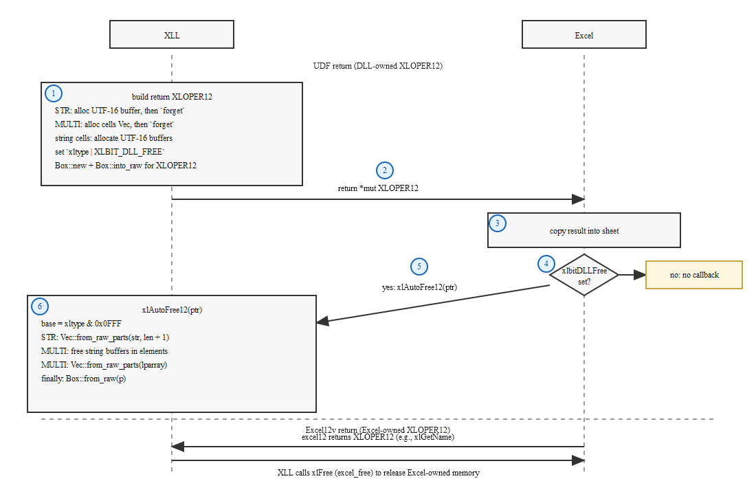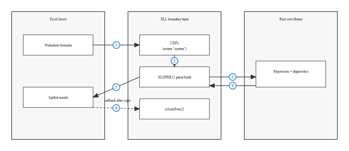 extern "system"UDF functions, plus the four Excel callbacks (xlAutoOpen,xlAutoClose,xlAutoFree12,xlAddInManagerInfo12). Each UDF parses XLOPER12 inputs into Rust types, calls the core, and builds an XLOPER12 result. Memory ownership transfers cleanly:Box::into_rawon the way out,Box::from_rawandVec::from_raw_partson the way back throughxlAutoFree12. No shared state between calls.Excel. The host process. It loads the XLL, calls