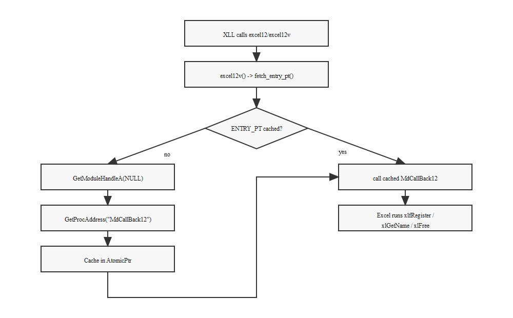 The callback trampoline. To call back into Excel (for UDF registration, retrieving the DLL path, freeing Excel-owned memory), you need to reach Excel’s internal entry point. The conventional approach links against a library that provides this. I resolve it at runtime instead: GetModuleHandleA(NULL) returns the host process handle (which is Excel itself, since the XLL is loaded into Excel’s process), and GetProcAddress("MdCallBack12") finds the callback function. The result is cached in an AtomicPtr on first use. The entire mechanism lives in entrypoint.rs, a single file of about 100 lines including type definitions, the cached lookup, and convenience wrappers.